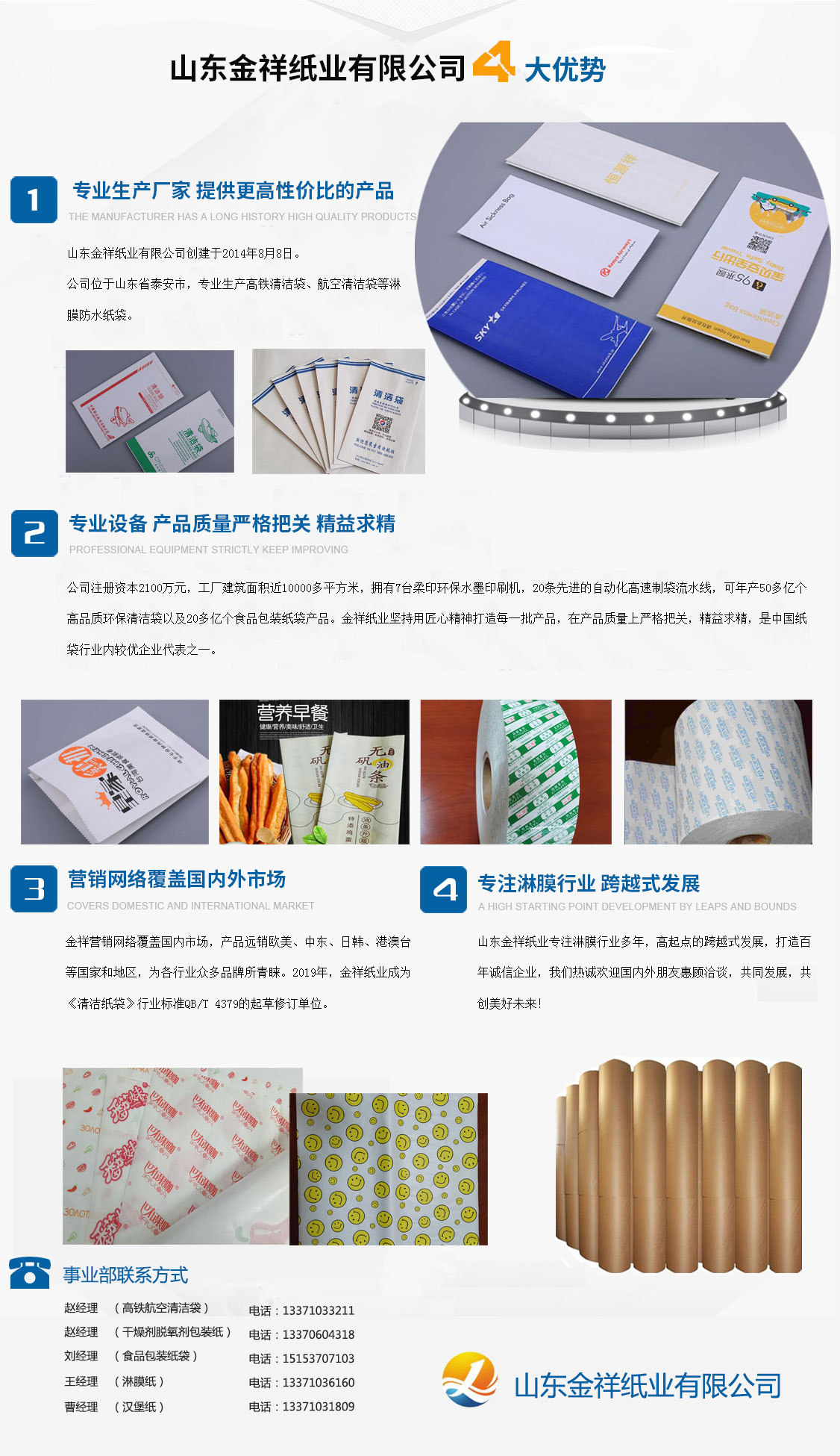 山東金祥紙業(yè)有限公司創(chuàng)建于2014年8月8日,公司位于山東泰安,專(zhuān)業(yè)生產(chǎn)高鐵清潔袋、航空清潔袋等淋膜防水紙袋。公司注冊(cè)資本2100萬(wàn)元,工廠建筑面積近10000多平方米,擁有7臺(tái)柔印環(huán)保水墨印刷機(jī),20條先進(jìn)的自動(dòng)化高速制袋流水線,可年產(chǎn)50多億個(gè)高品質(zhì)環(huán)保清潔袋以及20多億個(gè)食品包裝紙袋產(chǎn)品。金祥紙業(yè)堅(jiān)持用匠心精神打造每一批產(chǎn)品,在產(chǎn)品質(zhì)量上嚴(yán)格把關(guān),精益求精,是中國(guó)紙袋行業(yè)內(nèi)較優(yōu)企業(yè)代表之一。金祥營(yíng)銷(xiāo)網(wǎng)絡(luò)覆蓋國(guó)內(nèi)市場(chǎng),產(chǎn)品遠(yuǎn)銷(xiāo)歐美、中東、日韓、港澳臺(tái)等國(guó)家和地區(qū),為各行業(yè)眾多品牌所青睞。2019年,金祥紙業(yè)成為《清潔紙袋》行業(yè)標(biāo)準(zhǔn)QB/T 4379的起草修訂單位。